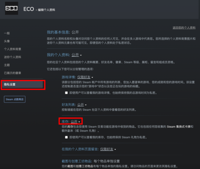 随后,在对应页面中将“我的个人资料”和“库存”设为公开即可。